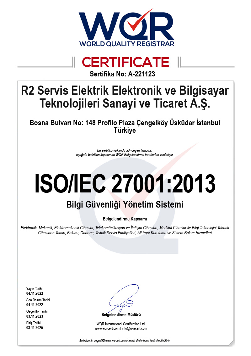 Bilgi Teknolojileri sektöründe bilgi güvenliği açısından öncü ve örnek bir kuruluş olmak hedefiyle, elde edilen bilgilerin muhafazası, gizliliği, bütünlüğü ve kullanılabilirliğini ilgili tüm yasal mevzuat ve standart şartlarına uygun olacak şekilde sağlayarak Bilgi Güvenliği Yönetim Sistemi sertifikasını almaya hak kazandık.