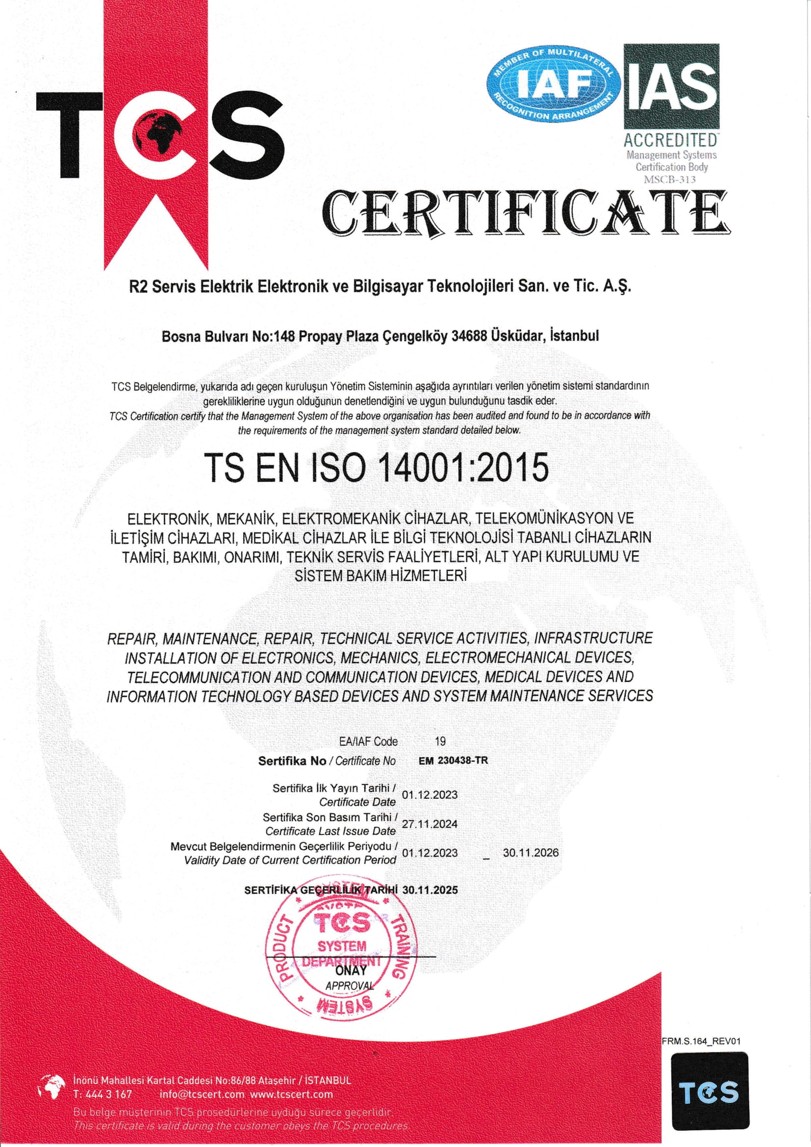 Ürün ve hizmetlerimizi Çevre mevzuat ve standart şartlarına tam uyum sağlayacak şekilde gerçekleştirmek üzere, faaliyetlerimizde Çevre faktörünün etkinliğini sağlamak, çevre bilincini artırmak, sürekli iyileştirmek, sürdürülebilirliğin çevre boyutuna katkı sağlamak amacıyla Çevre Yönetim Sistemini uygulamaya alarak sertifikamızı aldık.